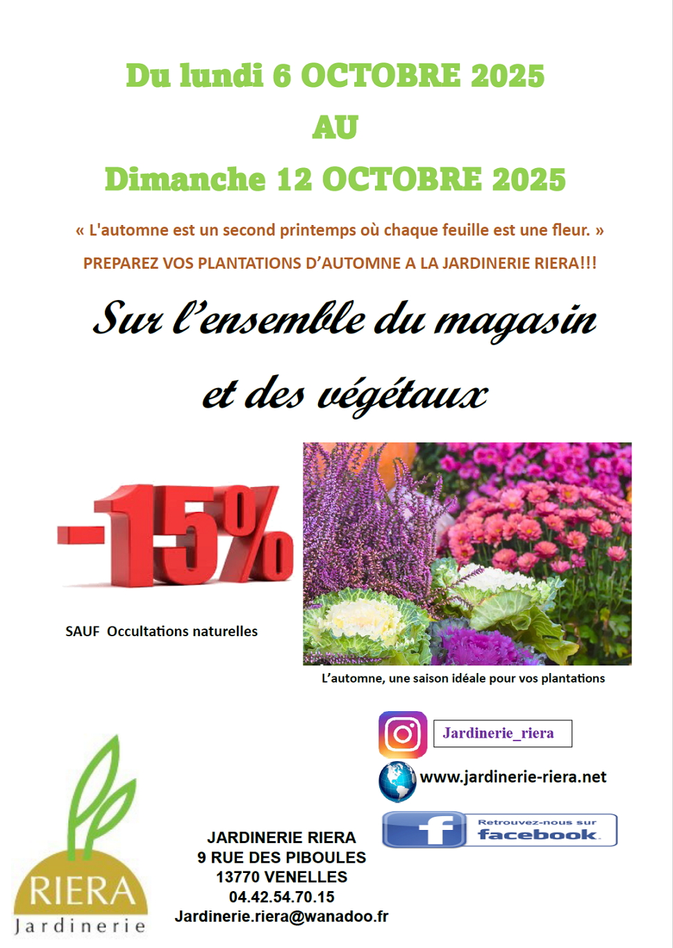 Du 06/10/25 au 12/10/25 -15% sur l’ensemble du magasin et végétaux dans Promo 3 octobre 2025 95 Vues Préparez vos plantations d’automne A la JARDINERIE RIERA du 06/10/25 au 12/10/25 -15% sur l’ensemble du magasin et végétaux, Sauf occultations naturelles 2025-10-03 azuradmin tweet