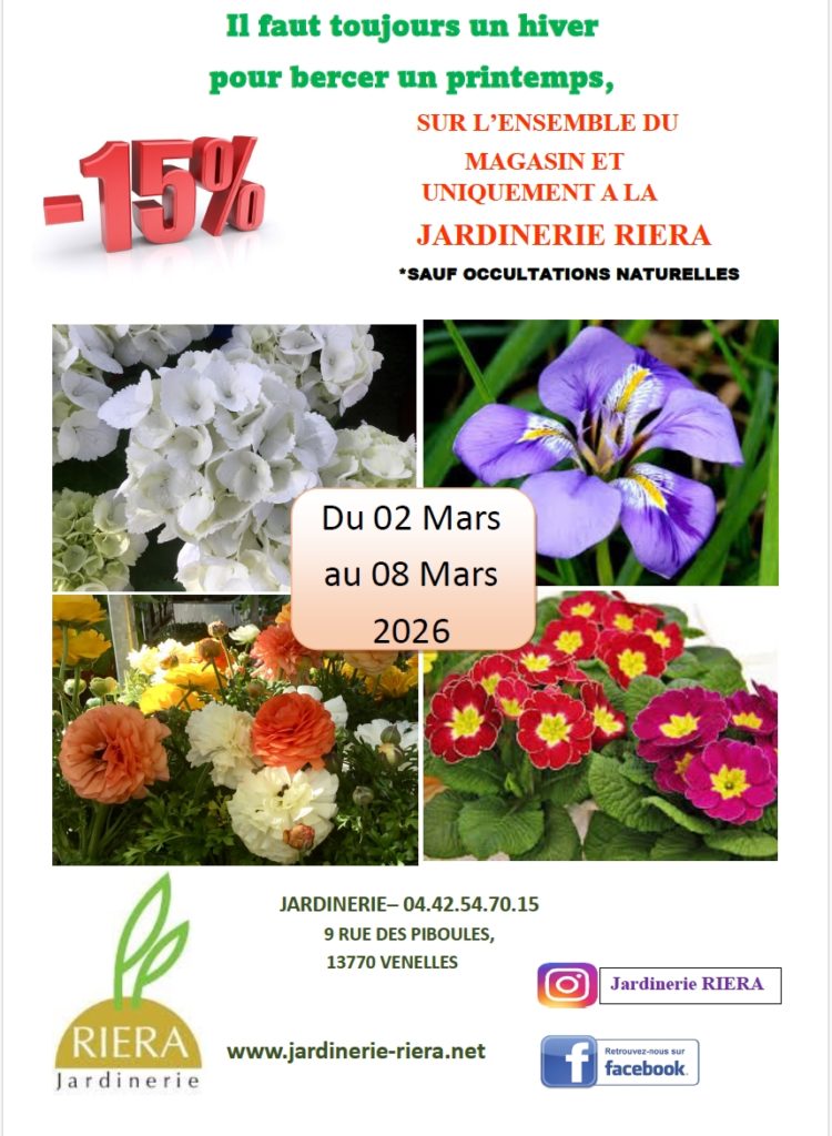 Promo – 15% à la Jardinerie Riera – du 2 au 8 mars 2026 dans Promo 26 février 2026 5 Vues Le printemps s’installe doucement DU 02/03 AU 08/03/26 -15% A LA JARDINERIE RIERA sur l’ensemble du magasin et des végétaux, sauf occultations naturelles 2026-02-26 azuradmin tweet